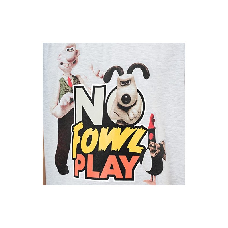 - A grey pyjama top featuring Wallace, Gromit and feathered fiend Feathers McGraw from The Wrong Trousers, with the slogan 'No Fowl Play'