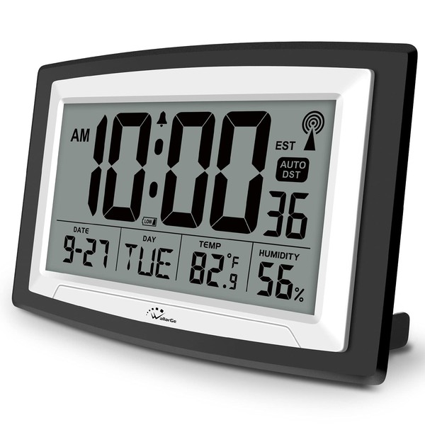 WallarGe Atomic Clock with Indoor Temperature and Humidity, 12.5 Inch Self-Setting Digital Wall Clock or Desk Clock, Battery Operated Digital Clock Large Display for Seniors, Auto DST
