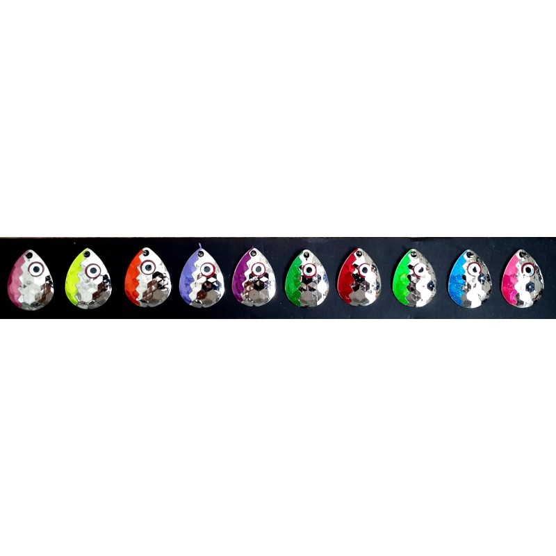 Material is Marine Brass .018 thick, Nickel Plated and Polished...Correct in shape, size and design, they are a result of many years of research and experience in manufacturing. These high quality brass blades are corrosion and rust-proof and their smooth burnished edges will not damage the line or leader. All plated blades are highly polished for that extra sparkle in the water. Blades have 10 colors Tape added for extra Flash. You get 10 blades.......1 of each color............