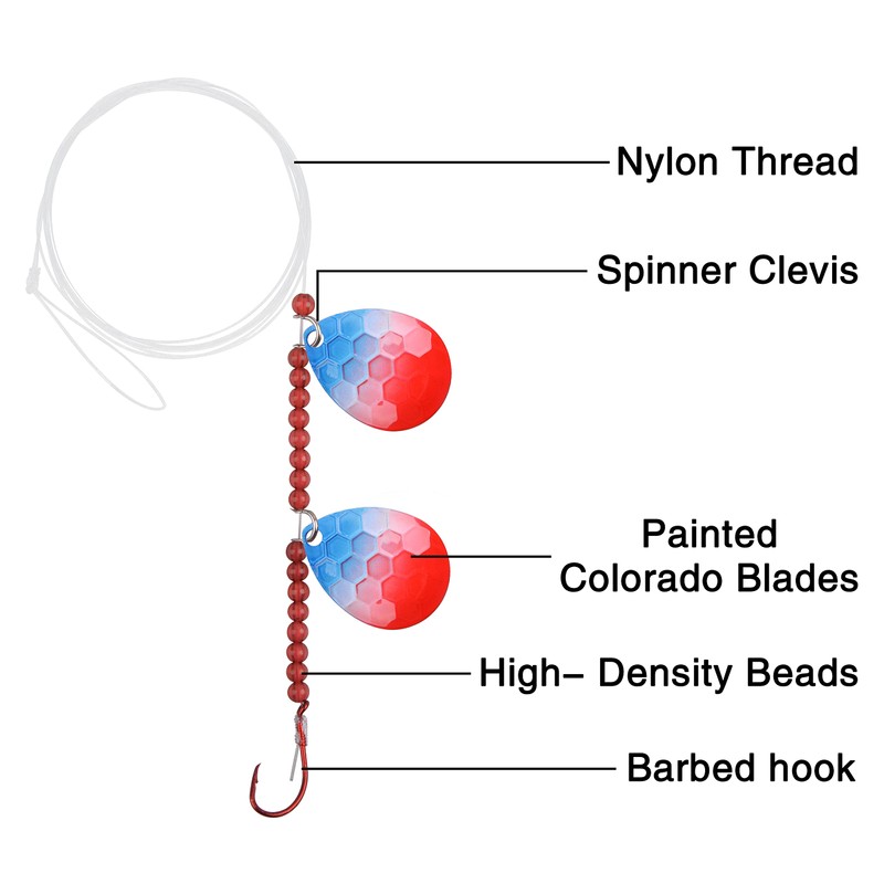 - 🎣【WALLEYE RIG】Crawler harness spinner rig kit include 2 hammered colorado blades, a mono leader 44in, red octopus hook, 2 spinner clevis and 17 fishing beads, all-in-one rig make fishing simple and get the bite effectively