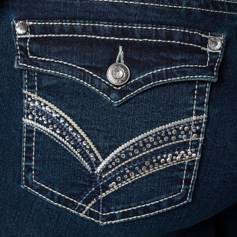 - All in the Details - Classic double-button closure, kick-leg opening, and fun pocket accents on women's stretch jeans made to stand out. From 90s throwbacks to weekend plans, this pair keeps your look laid-back, stylish, and effortlessly cool.