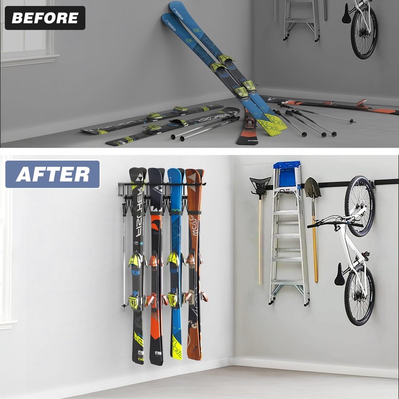 • Multi-Function Storage Rack: While designed for skis, this versatile wall rack also works great for organizing tools like brooms, mops, shovels, and rakes. Mount it on any solid surface for added convenience