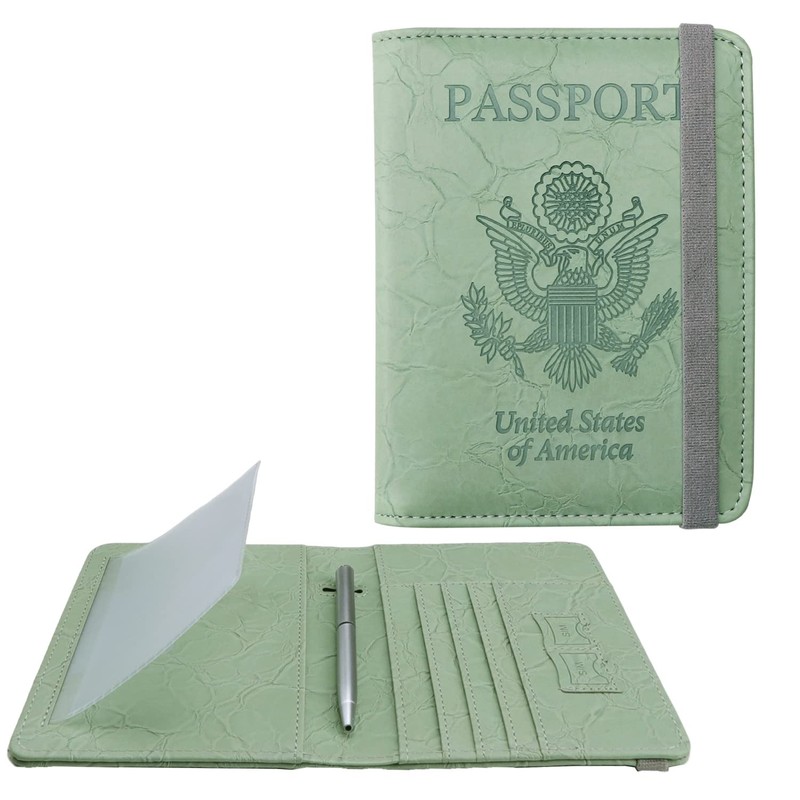 WALNEW Passport Holder for Travel, RFID Passport Cover Wallet for Women Men, PU Leather Passport Book Case with Pen Holder and Clear Photo Slot, Light Green