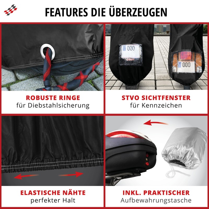 - Public parking: thanks to the welded and waterproof viewing window, the rain cover / all weather protection for the motorcycle, scooter can also be used on public parking spaces as a tarpaulin for scooter or motorcycle garage winter. In addition, the scooter tarpaulin has two sturdy rings for attaching an anti-theft device or additional attachments