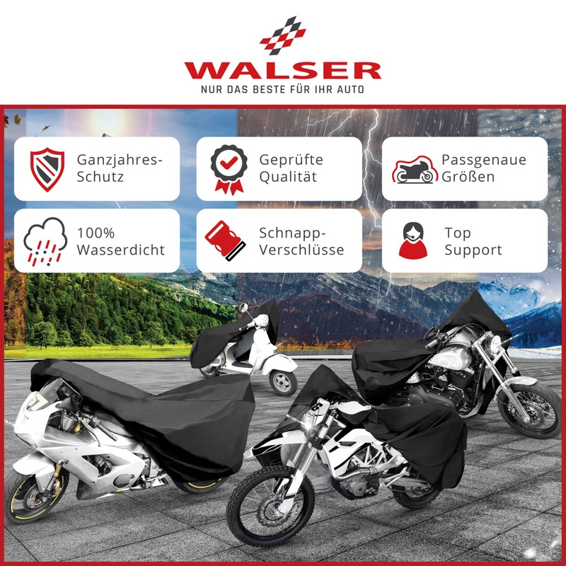 - Reliable protection: with the Walser All Weather Basic motorcycle cover including practical storage bag, you can protect your scooter, scooter, moped, motorcycle, motocross or motorbike all year round from external influences such as rain, snow, UV radiation or impurities such as leaves, bird droppings, pollen or dust. The perfect motorcycle accessory/moped accessory compatible with BMW, Honda, KTM, Kawasaki, Yamaha, Harley-Davidson, Ducati or Triumph