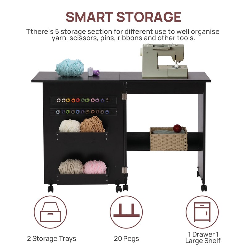 - 【Mobility and Stability】-Equipped with five casters, this sewing machine table ensures effortless mobility. Securely locks on wheels, allowing you to position it as your preference.