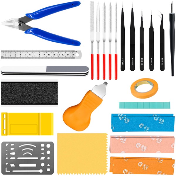 - [28Pcs Model Starter Kit] The 28Pcs model beginner kit contains hobby clippers with plastic cover, 5pcs mini diamond files, 5pcs precision tweezers, 6pcs sponge sandpapers (600 grits, 800 grits, 100 grits), 1pc 4-ways buffer block, 1pc 100/180 grit black sanding stick, 1pc model separator, 1pc masking tape, 1pc fluid ruling pen, 1pc cleaning cloth, 1pc steel ruler, 1pc model opener, 1pc modeling stencil, 1pc modeling clay. The model making tools kit is suitable for a beginner and advanced.