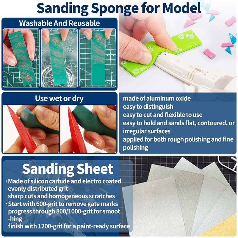 - [Polishing Tools for Details] The diamond files are designed to smooth moulding imperfections on your mini-figures, file down rough spots without losing details. The sanding sponges are hard to be torn and getting wrinkles and creases, which can be cleaned with water, brushed with a brush to restore the sanding effect for reuse. The sandpaper and polishing sticks designed for sanding models, which can greatly reduce the fall of sanding particles.