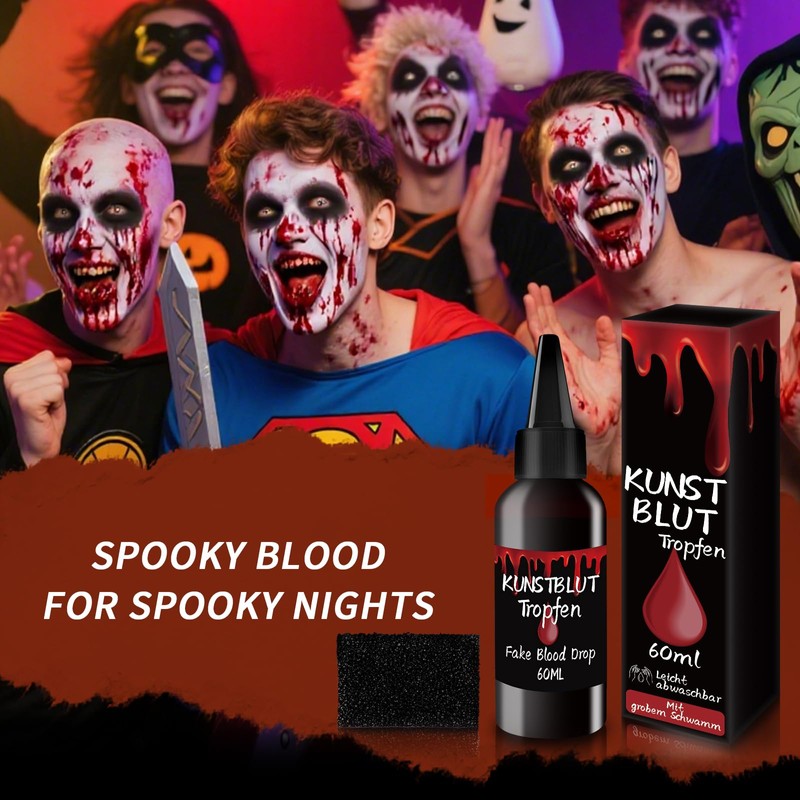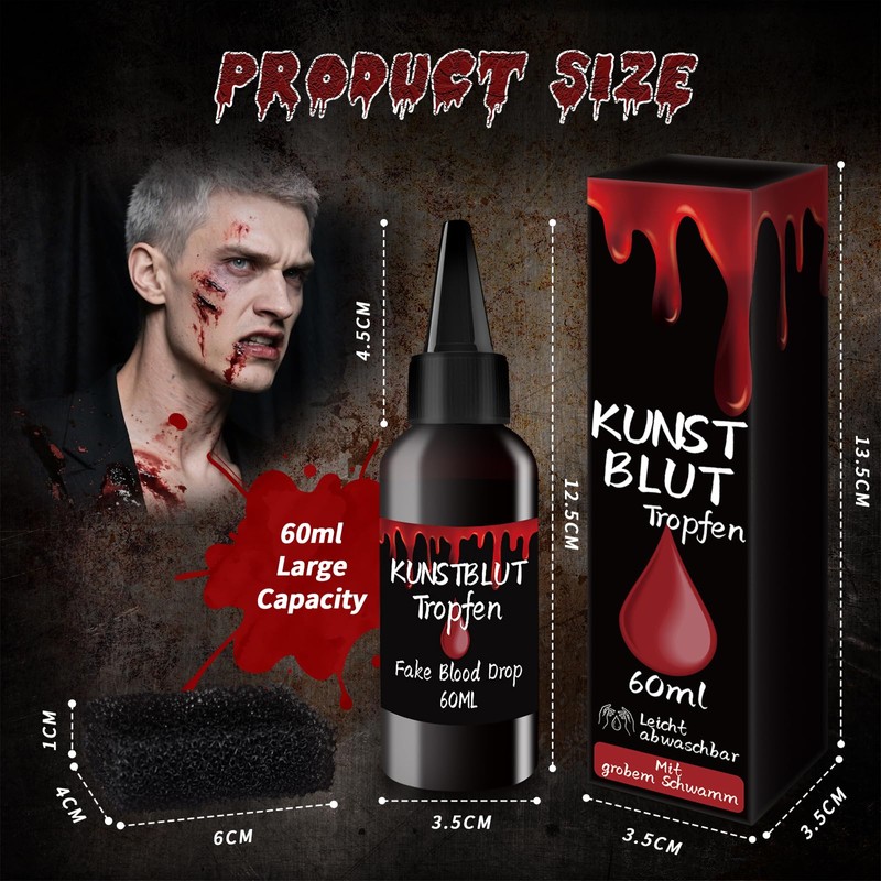 - 【HALLOWEEN KUNSTBLUT SET】Sie erhalten eine 60-ml-Flasche Halloween Blut mit Make-up-Schwamm und spitzen Deckel. Das Kunst Blut Halloween hat eine tiefrote Farbe, die die Konsistenz von Blut imitiert. Tragen Sie es einfach auf Ihr Gesicht, Ihren Körper oder Ihr Halloween Kostüm auf und kreieren Sie sofort einen gruseligen Halloween-Look!