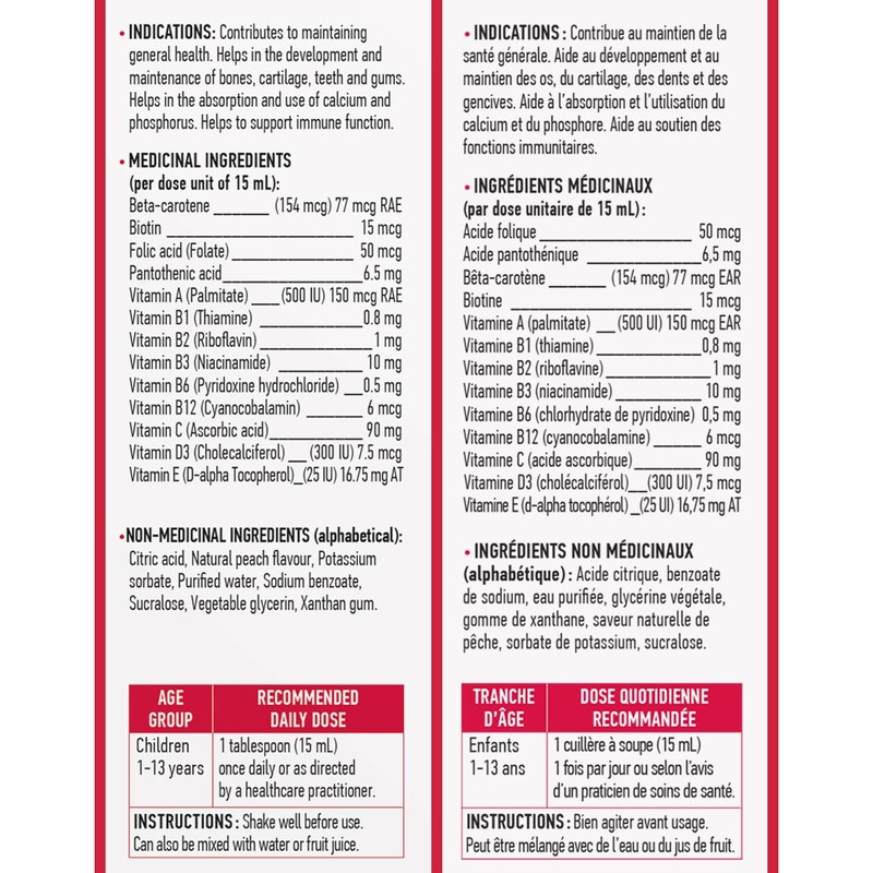 - THE VITAMINS YOUR KIDS LOVE: Give 1 tablespoon 15 ml per day. With its natural no sugar added peach flavour, it can be mixed with water, fruit juice and are a perfect match with their breakfast.