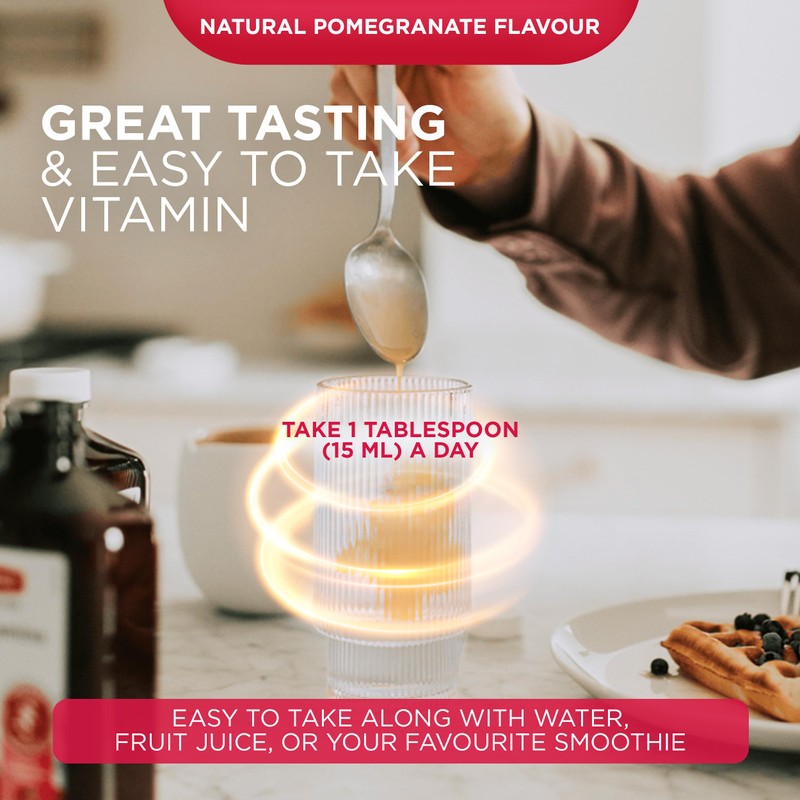 - GREAT NATURAL POMEGRANATE FLAVOUR - Take 1 tablespoon (15 ml) daily. Enjoy its natural pomegranate flavor by itself, with water or with fruit juice. Always follow label instructions for dosage.