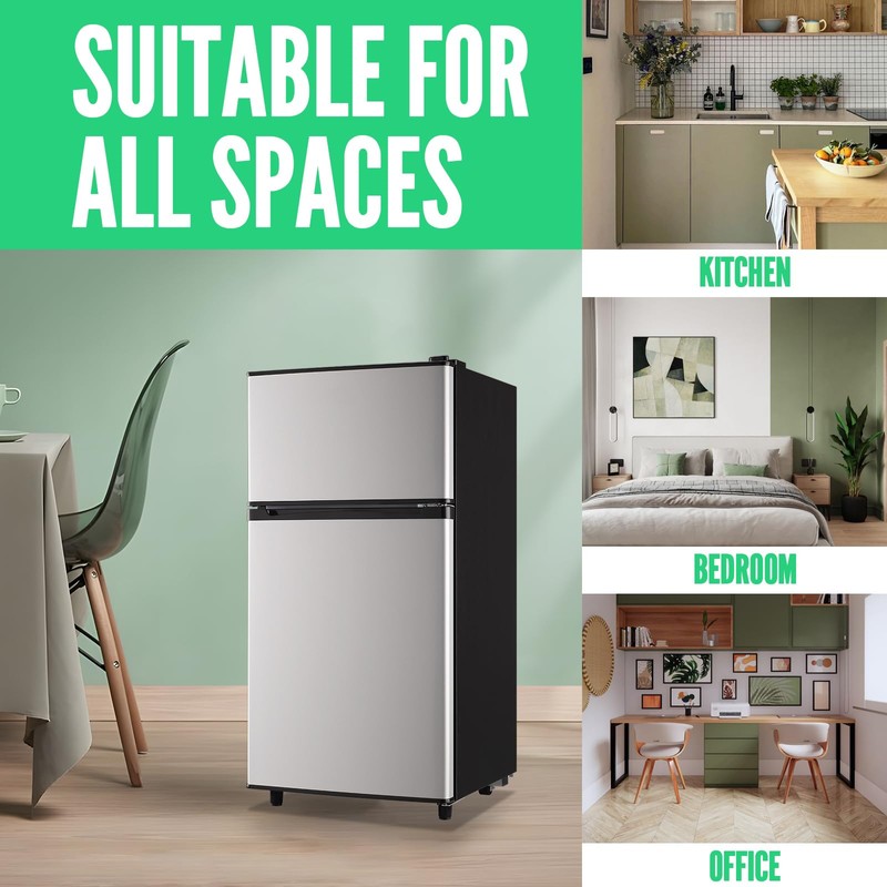 WANAI Mini Fridge with Freezer, 3.5 cubic feet 2- Doors Small Refrigerator Features 7 Gear Mechanical Control, Side Bottle Rack, Ideal for Dorm, Kitchen, Apartment, Office, Silver