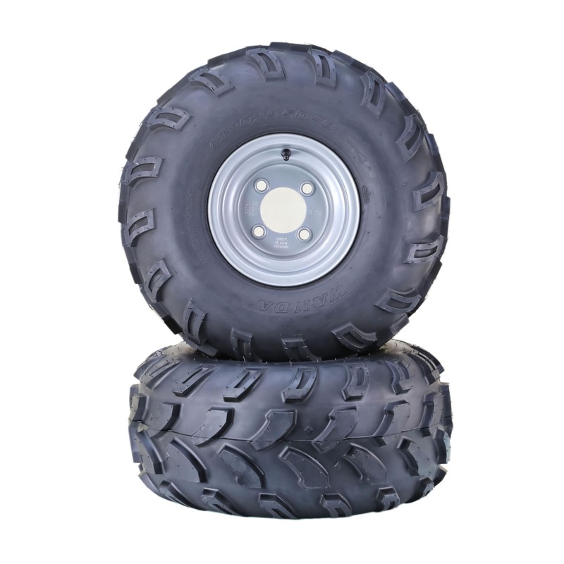 Low profile design for controlled sliding and added comfort and stability. Directional “V” angled tread design with wide gaps between tread blocks promotes; Cleaning action for better traction over rough terrain. Additional shoulder lugs protect rim and sidewall;. Heavy 4 ply rated, Tread depth: 0.6", Rim Width: 7", Max Load: 310lbs@10psi. WHEEL DETAIL: 4 Lugs on 4" bolt pattern, center hole: 2.83" , offset: -2, style: Silver. Heavy 4 ply rated nylon construction resists punctures and abrasions;
