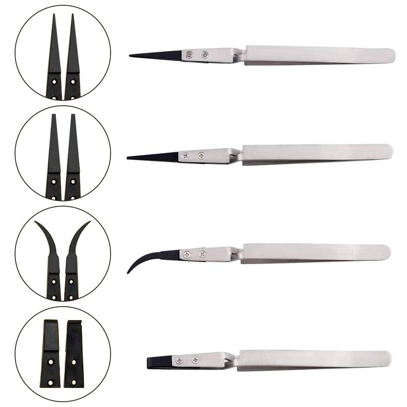 - PREMIUM MATERIAL -- These craft tweezers are made of high strength stainless steel, durable and non-irritating, not easy to deform, and easy to clean. And the plastic tips are anti-static, which are firmly connected with the handle by screws.