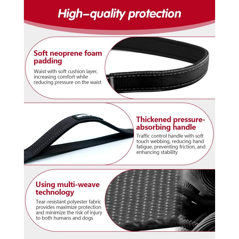 - 🦮【SOFT TOUCH DOUBLE HANDLE LEASH】On both handles are soft neoprene foam pads, which help reduce pressure and wear on the waist, shoulders and hands. Even if you have a strong and active dog, this feature helps absorb shocks and impacts during walks! ⚠️According to customer suggestions, we adjusted the handle close to the dog and moved it up 20 cm to make it more convenient to operate.
