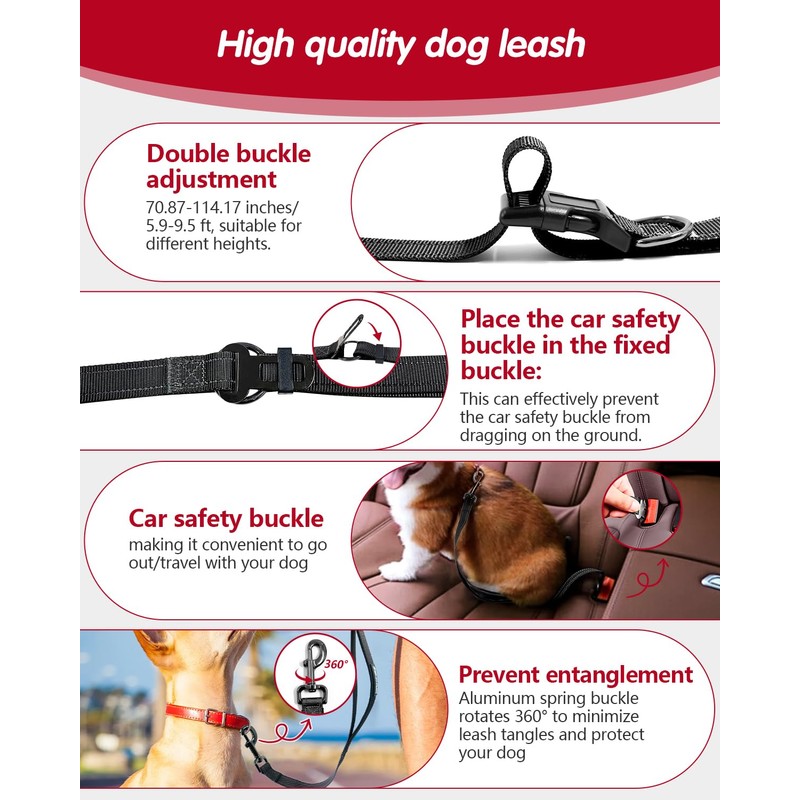 - 🦮【CAR SAFETY BUCKLE DOG LEASH】The dog leash includes a safety buckle to ensure the safety of your pet in the car while traveling. The car safety buckle can help dogs stay stable in the car, help dogs adapt to the car environment and reduce anxiety.