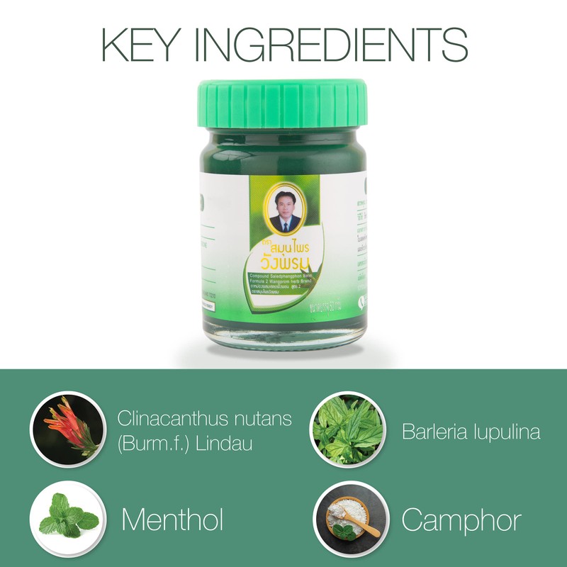 - ALL-NATURAL BENEFICIAL INGREDIENTS: Very popular and helpful massage balm is made of natural herbs. Ingredients : Barleria lupulina Lindl(Salade-Pangpon) ,Clinacanthus nutans (Phayayor), Menthol, Camphor. Thai Traditional herb used for many years.