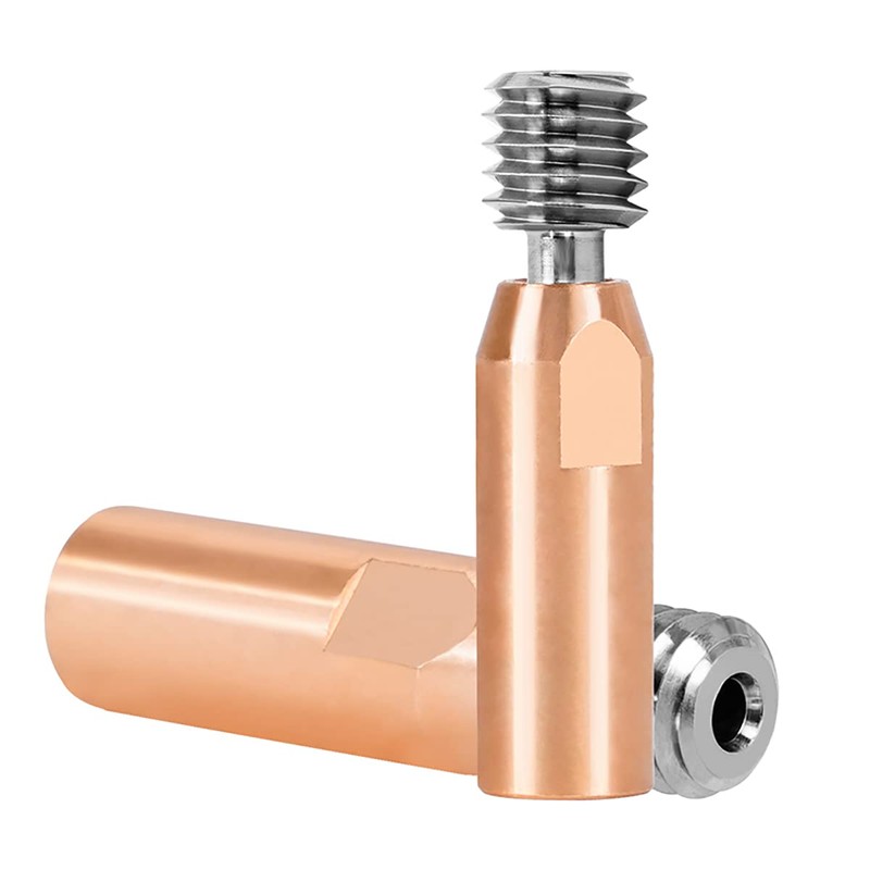 This product adopts Bimetallic throat branch design,the front end is made of titanium ,which has strong thermal barrier ability.The rear end is made of copper alloy material, .while copper is used to accelerate the heat conduction.Simultaneously higher hardness and wear resistance,The inside of the product is treated by a special process, and the inner wall is smooth and free of burrs; compared with ordinary throat tube, the resistance of printing retraction is reduced by 90%, and the printed product is more precise and delicate.