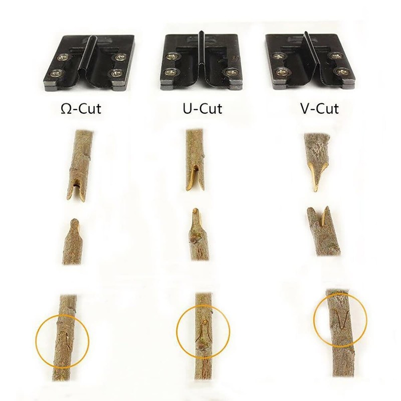 Step 4: Place the grafting area where the graft is needed, and take care to ensure that the groove is cut in the stock plant. The grafting tool with "V & U & Ω" blade and the end of blade both can cut, one piece blade can be used as two pieces blade.