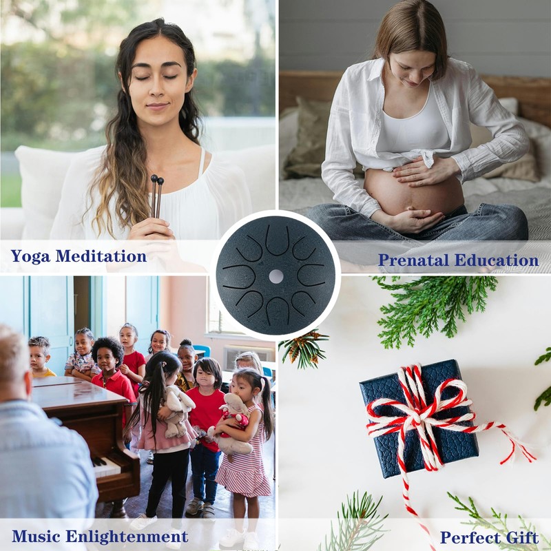 - 【Best for beginners】This 4.5-inch steel drum,a balmy drum for kids,features 8 notes that produce different rhythms through circular vibrations of the air and drum body. Its ethereal sound reverberates longer than other instruments, providing a relaxing and pleasurable experience. Playable with mallets, it offers a broad sound spectrum for musical expression. The included note chart simplifies the learning process, especially for beginners, enabling them to pick up and play with ease