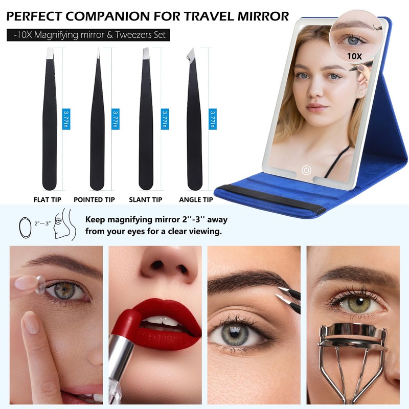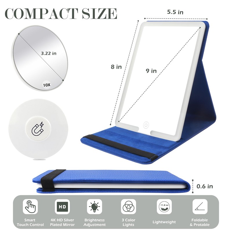 WangSelect Espejo de viaje con luz, espejo de maquillaje portátil de viaje, recargable de 2000 mAh y 3 ajustes de color, incluye 10 espejos de aumento y pinzas, azul cobalto