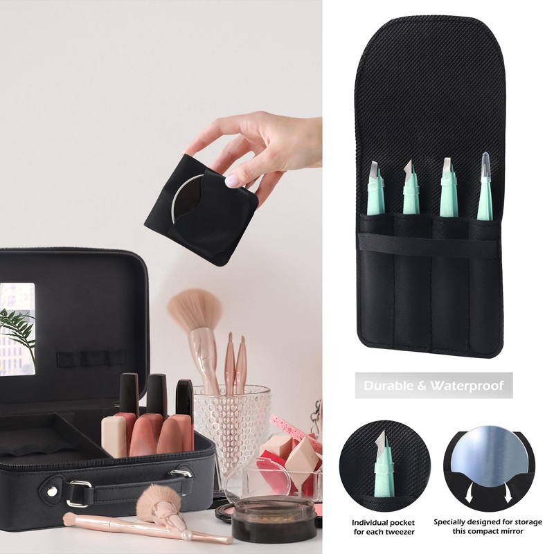 - ·【Juego de pinzas de valor imprescindible】Las pinzas son pequeñas y ligeras, combinadas en una fina funda de piel de viaje y portátiles para llevar sin caerse ni perderlas. Nuestra bolsa compacta evita el desorden con compartimentos divididos, es adecuada para ser colocada en tus bolsas de cosméticos o fundas cuando salgas o viajas. Diseñado para mujeres y hombres para cumplir con su rutina de aseo de cejas.