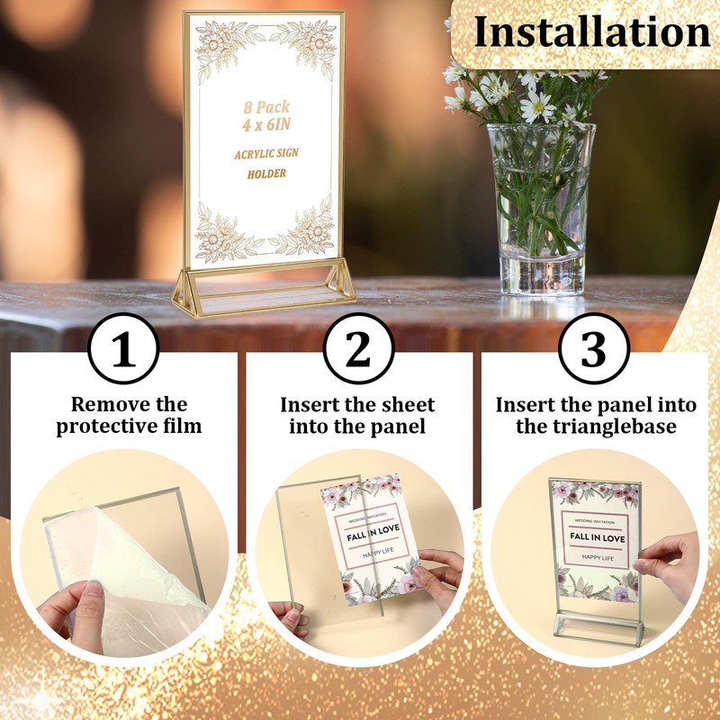 - Durable Acrylic Sign Holder: Experience the perfect blend of style and durability with our high-quality acrylic sign holder, adorned with stunning gold frame in a 4x6 dimension. These gold picture frames 4x6 are meticulously crafted to withstand the test of time, ensuring your picture holder remains stable and secure on tables, even during bustling events.