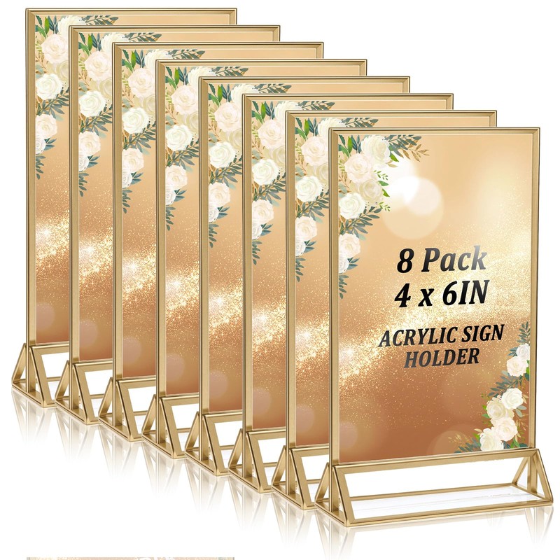 Wanmu 8Pcs Acrylic Sign Holders with Golden Border, 4x6 Inches Double Sided Clear Picture Photo Frames Display Stand, Menu Flyer Holder for Wedding reception, Centerpiece, Decoration, Party