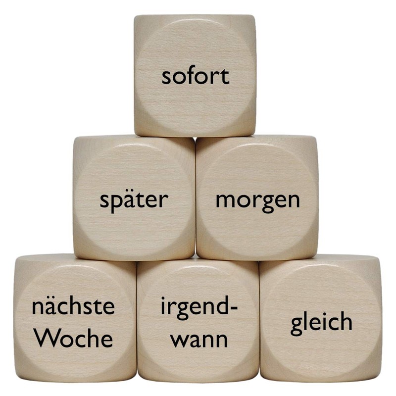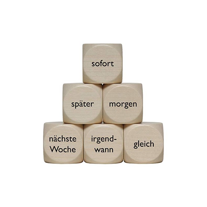 “Wann?” German-Language Wooden Cube, 30 mm, 1 Piece. - The image shows the labelling of all six sides - you will receive 1 cube.