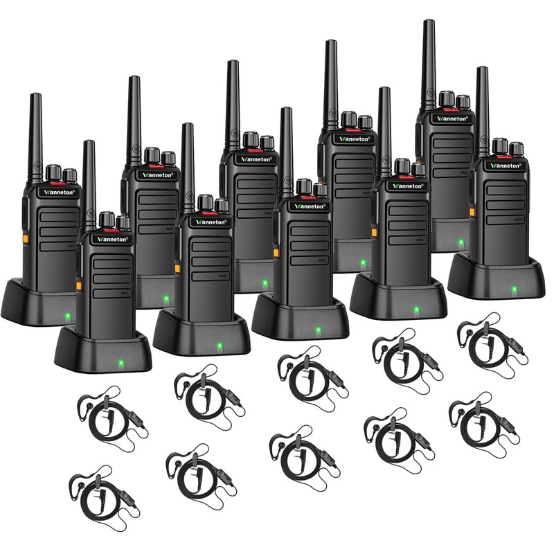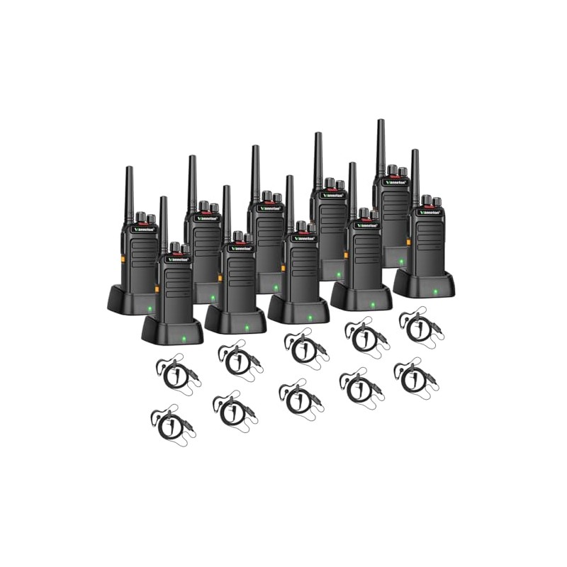 - Package Contents: You'll receive 10 x walkie-talkies, 10 x antennas, 10 x 1500mAh batteries, 10 x chargers, 10 x lanyards, 10 x belt clips, 10 x headsets, and 10 x user manual in the package.