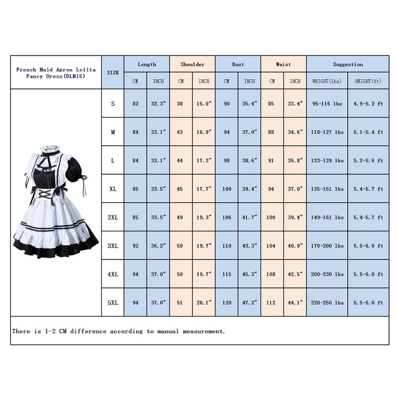 Women's mens sexy french apron sweet lolita maid princess costume anime cosplay lolita fancy dress with cute faux fur cat fox wolf dog ears headband bow-knot lolita over the knee high socks satin smooth gloves accessories.Halloween party cosplay,maid sama outfit cosplay, stage show ,valentine's day gift ,french apron maid caf event , anime sissy maid costume accessories,neko maid cosplay costume.Perfect gift for Japanese kawaii anime fans who want to cosplay Japanese anime cute cat neko maid outfit costume.Size Information:Size SSuggestion Height(ft)4.9-5.2 Weight(lbs)95-116;Dress Length 32.3"----Shoulder 15.0"----Bust 35.4"----Waist 33.4"Size MSuggestion Height(ft)5.1-5.4 Weight(lbs)110-127;Dress Length 33.1"----Shoulder 16.9"----Bust 37.0"----Waist 34.6"Size LSuggestion Height(ft)5.2-5.6 Weight(lbs)123-139 ;Dress Length 33.1"----Shoulder 17.3"----Bust 38.6"----Waist 35.8"Size XL: Suggestion Height(ft)5.4-5.7 Weight(lbs)135-151 ;Dress Length 33.5"----Shoulder 17.7"----Bust 39.4"----Waist 37.0"Size 2XL: Suggestion Height(ft)5.4-5.7 Weight(lbs)149-161 ;Dress Length 33.5"----Shoulder 19.3"----Bust 41.7"----Waist 39.4"Size 3XLSuggestion Height(ft)5.5-6.0 Weight(lbs)170-200 ;Dress Length 36.2"----Shoulder 19.7"----Bust 43.3"----Waist 40.9"Size 4XLSuggestion Height(ft)5.5-6.0 Weight(lbs)200-230 ; Dress Length 37.0"----Shoulder 19.7"----Bust 45.3"----Waist 42.5"Plus Size 5XLSuggestion Height(ft)5.5-6.0 Weight(lbs)220-250 ; Dress Length 37.0"----Shoulder 20.1"----Bust 47.2"----Waist 44.1"