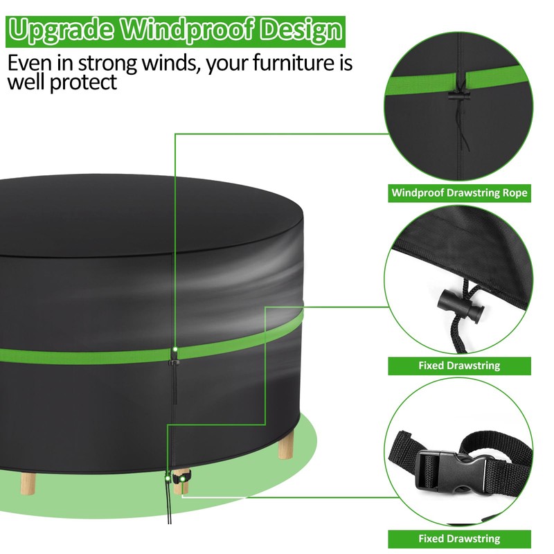 - Dual Windproof Design: This outdoor furniture cover is equipped with adjustable drawstrings at the middle and hem, along with 4 buckle straps that can be firmly secured to table or chair legs. Even in windy weather, the patio table cover will stay in place and not be blown away. (In strong winds, please ensure all 4 buckle straps are fastened securely.)