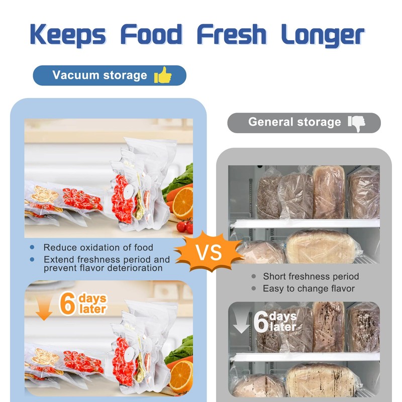 • 【Longer Freshness】Vacuum bags can extend the freshness of food 5 times to avoid food deterioration. Portable vacuum sealer can be used not only for kitchen meal preparation, food preservation after meals at home, but also for outdoor camping, etc.