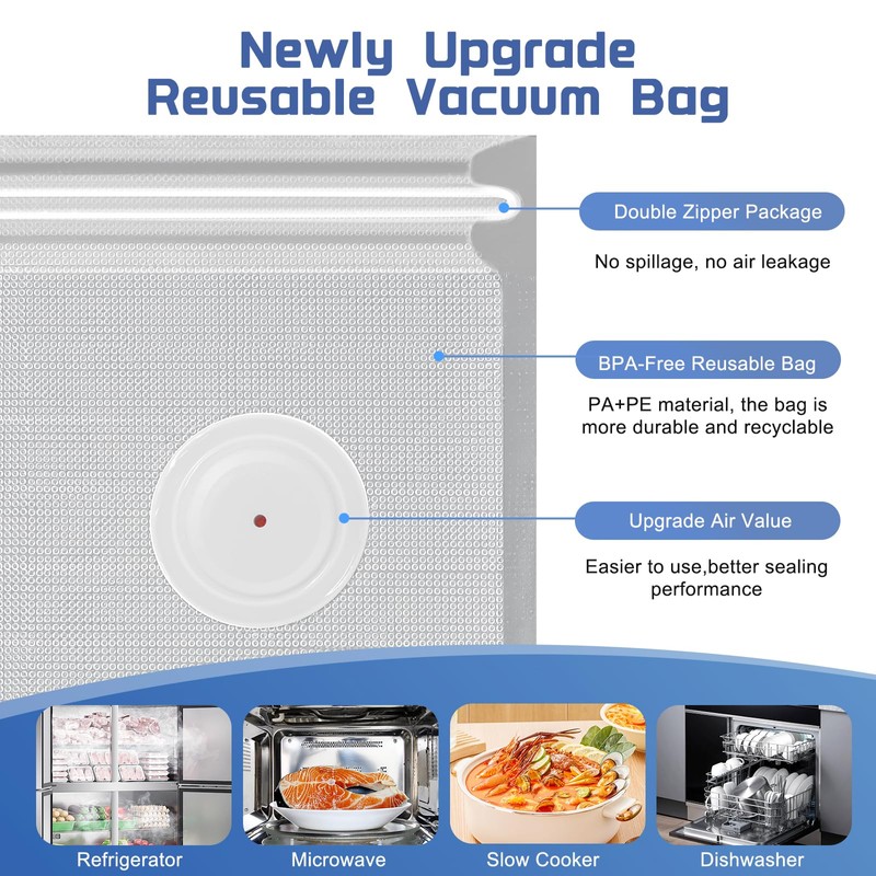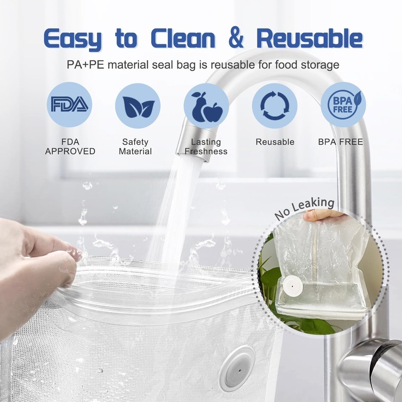 • 【Upgraded Design】Reusable vacuum bags with upgraded sealing air pressure valve and thickened double sealing zipper, it can be vacuumed more capacity, better vacuum performance, the food storage bag is made of food-grade PA + PE material, BPA-Free, the handheld vacuum sealer housing is made of ABS, it can be loaded with moist and dry food such as fruits, steaks, and other frozen foods, dried fruits, grains, etc., reusable and easy to clean.