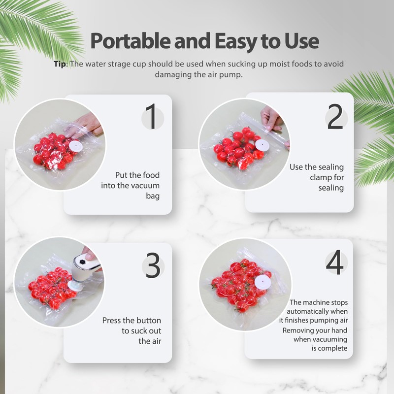 - 【Longer Freshness & Wide Application】Using food storage bags can extend the freshness by 5 times. Portable vacuum sealer for food can be used not only for kitchen meal preparation, food preservation after meals, but also for outdoor camping to save time and space and prevent moisture.
