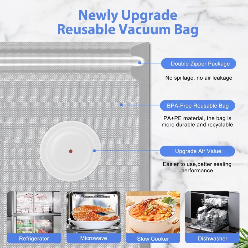 - 【Upgraded Design】Reusable Vacuum Bags with upgraded sealing air pressure valve and thickened double sealing zipper, BPA-Free, more capacity and better vacuum performance, the sous vide bags are made of food-grade PA + PE material, the handheld vacuum sealer housing is made of ABS. Portable vacuum sealer machine will stop automatically after the vacuum is completed.
