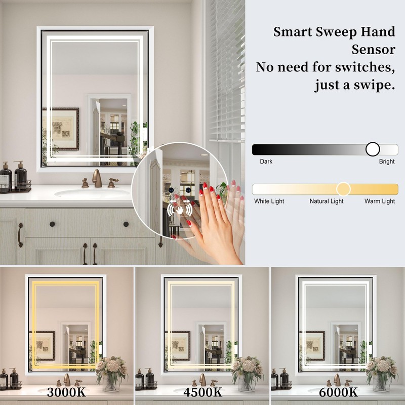 - 【3 Color Temperature & Dimmable】Just wave your hand, the led framed mirror will automatically turn on or off the lighting and defogging functions, as well as adjust the lighting with 3-color temperatures (within 3 seconds); keeping your gesture still in the sensing area, the brightness of the mirror will change accordingly (flashing to indicate the darkest or brightest); you can customize it for makeup, skincare, shaving, and dressing; the memory function helps remember your last-used settings