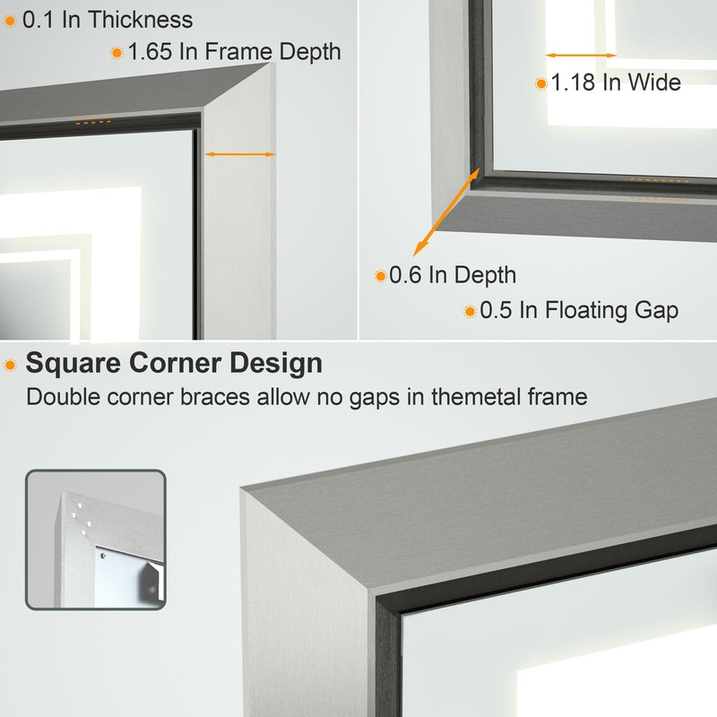 - 【Amazing Craftsmanship】Wansi Shine LED bathroom mirror is a stunning blend of craftsmanship and aesthetics. Its beveled aluminum alloy metal frame adds a stylish touch while ensuring durability. What truly sets this silver framed LED mirror apart is the subtle 0.5- inch gap between the frame and mirror, creating a captivating 3D floating effect. With its timeless charm, the dimmable frontlit mirror is a perfect choice for those seeking a complementary addition to any room