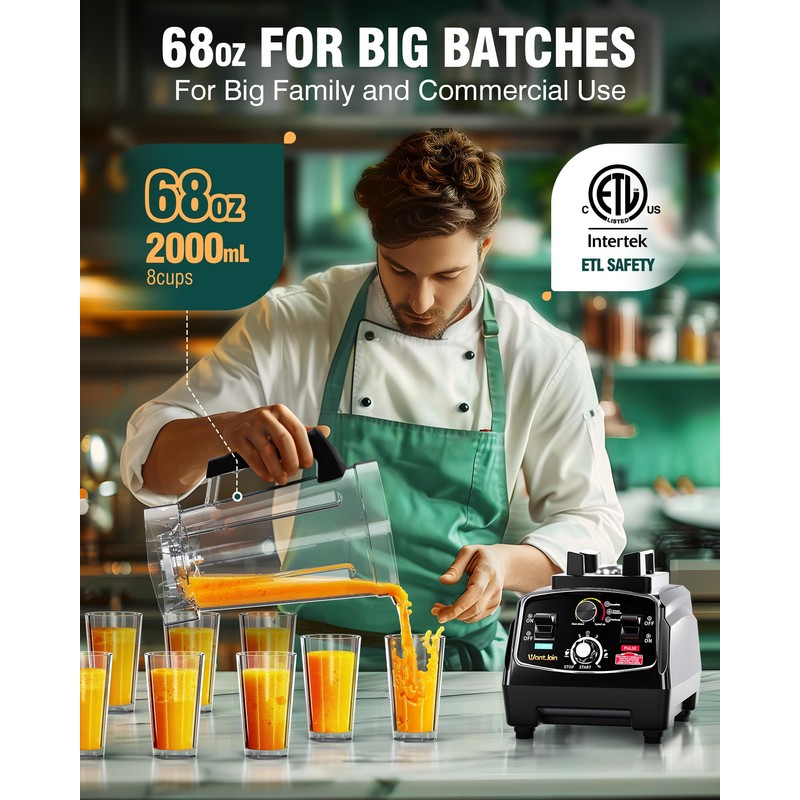 - POWERFUL ICE CRUSHING: Featuring a maximum 2.5HP motor and hardened 304 stainless steel 6-blade assembly, this commercial blender for restaurant achieves up to 30,000 RPM. Effortlessly blend ice, carrots, and other tough ingredients in seconds, making it ideal for high-frequency use in commercial blenders settings.