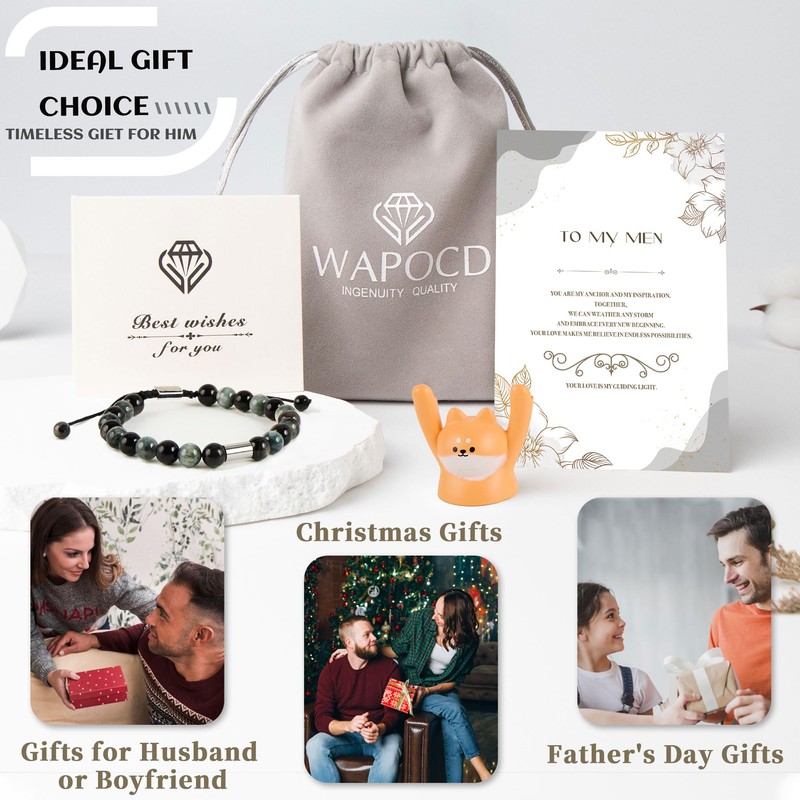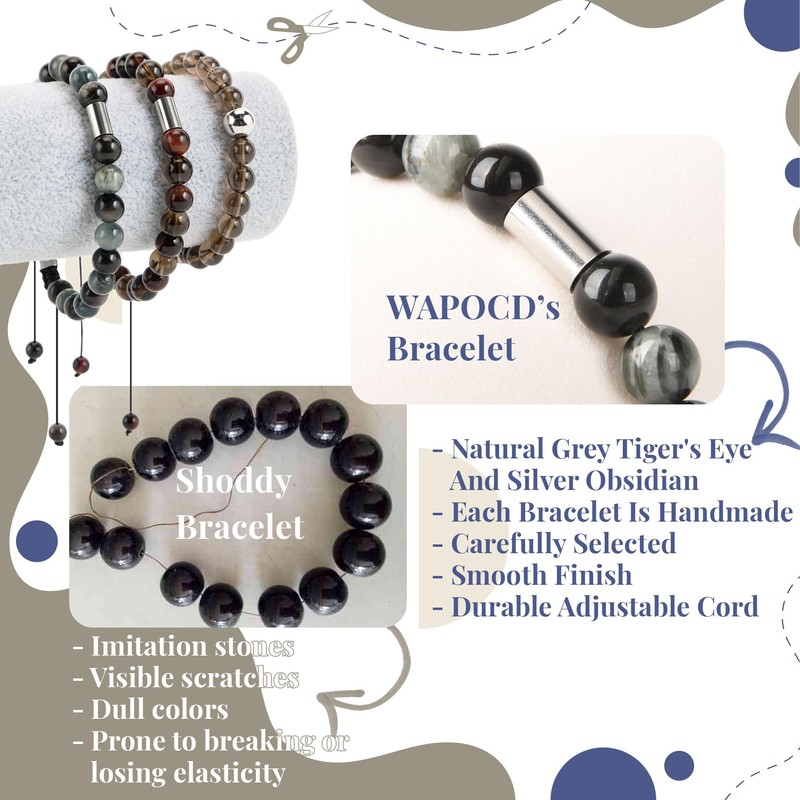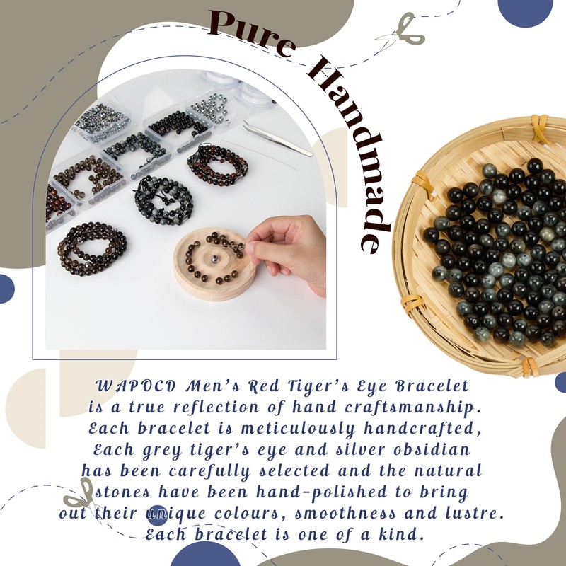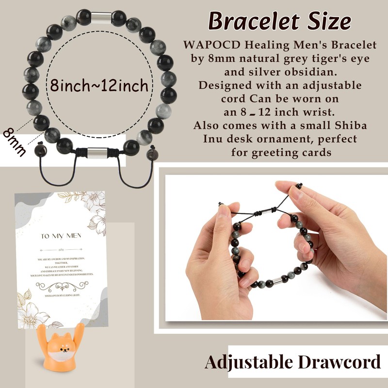 - 𝙉𝙖𝙩𝙪𝙧𝙖𝙡 𝙃𝙚𝙖𝙡𝙞𝙣𝙜 𝙎𝙩𝙤𝙣𝙚𝙨:WAPOCD's bracelet features natural obsidian and gray tiger eye stones, known for their protective and grounding properties. Obsidian is believed to shield against negative energies and bring emotional clarity, while gray tiger eye enhances focus, willpower, and determination. Together, they make a meaningful gift for men who value strength, protection, and inner balance.