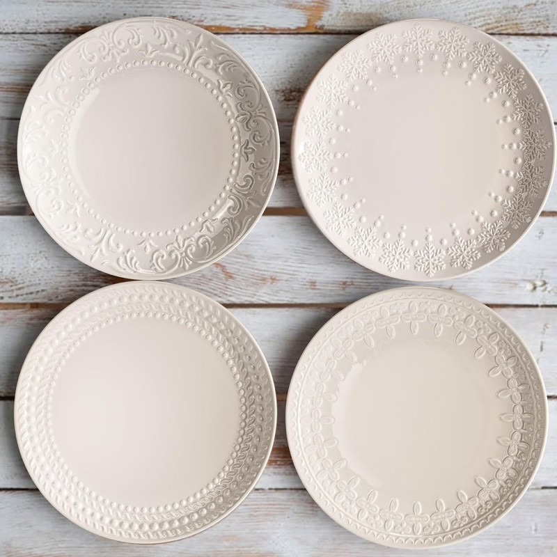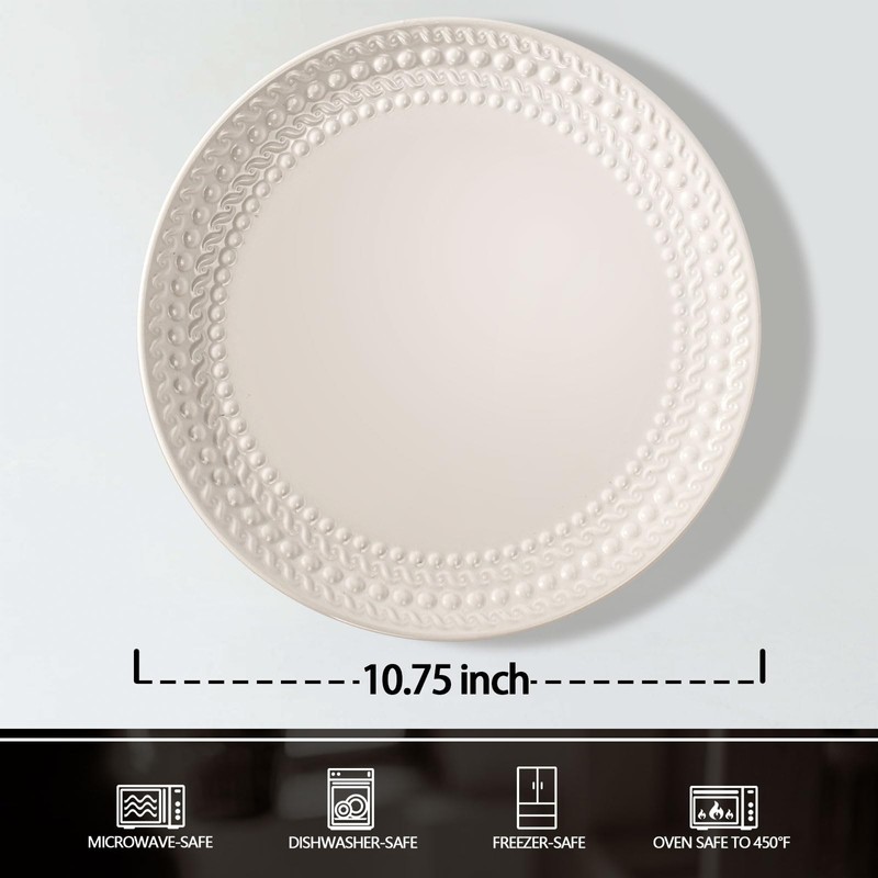 - 【Versatile Plates】Each plate measures 10.75 x 10.75 x 1.2 inch, These ceramic dinner plates have a slope all around the edge to prevent food runaway, Perfect size for your everyday dessert, snacks, and bread, even for foods with sauce, sides, breads, cheese, fruits, and crackers and more. These embossed plates will be your best go to plate on any parties.