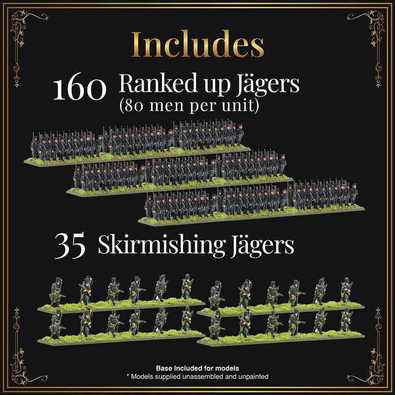 - CONTAINS: Bespoke A5 Black Powder: Epic Battles Rulebook, assembly and painting guide, Full-colour flag sheet, 8 mounted commanders, 8 units line infantry (80 per unit), 5 units Landwehr infantry (80 per unit), 2 units of ranked up Jägers (80 per unit), 35 Skirmishing Jägers, 5 bases Landwehr cavalry, 3 bases Prussian Dragoons, 3 bases Prussian Uhlans, 3 bases Prussian Hussars, 2-pdr foot artillery battery (8 guns), 6-pdr horse artillery battery (3 guns), Windmill scenery piece, 6 D6 dice