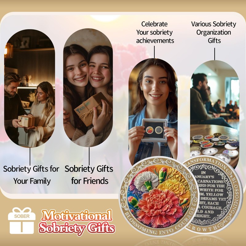 - Elegant Carnation: On the front of the sobriety chip are red, white and yellow carnations, symbolizing courage, purity and hope. The carnation blooms in the face of adversity, symbolizing the holder's continued bravery in facing life's challenges on the road to sobriety. Ideal for celebrating 1 month of sobriety, the AA Coin/NA Coin features the words “BLOSSOMING INTO COURAGE” reminding us that sobriety is a process of self-recovery, symbolizing growth and blossoming in courage