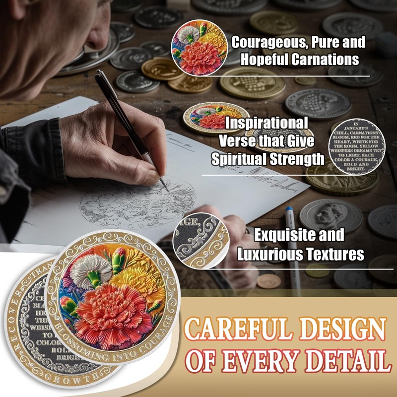 - Inspirational Verse: The reverse side of the Carnation Sobriety Coin is inscribed with the poetic text, "In January's chill, carnations bloom, red for the heart, white for the room. yellow whispers dreams yet to light; each color a courage, bold and bright." This verse on the AA Chip/NA Chip connects the color of carnations to the different stages and emotions of sobriety, encouraging us to find courage and hope in the challenges of sobriety