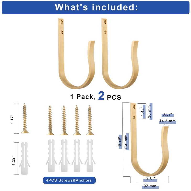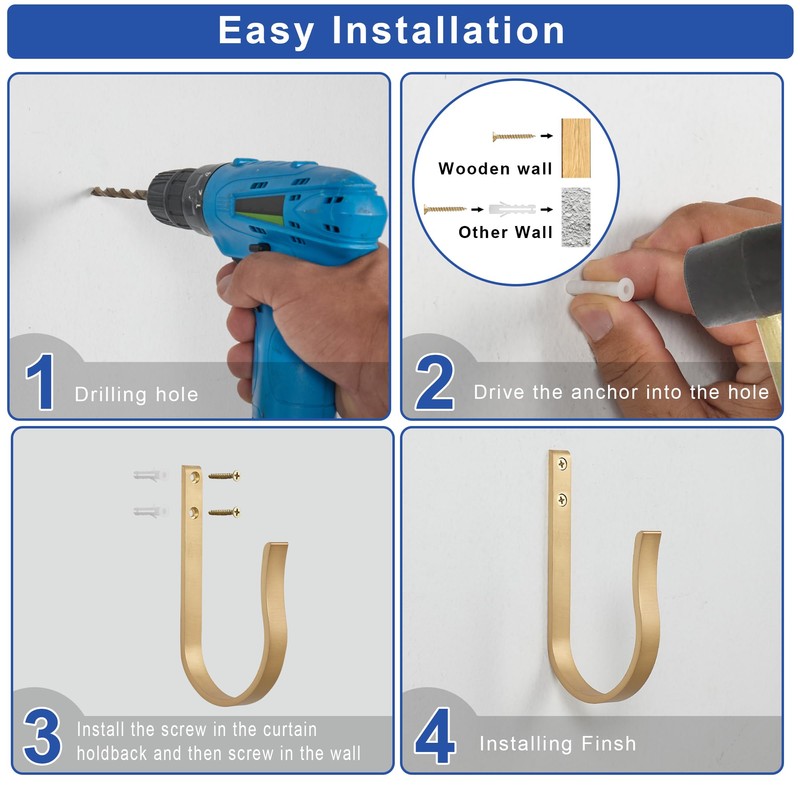 - 【1PACK,2PCS】- Each package contains 2 U-shaped drapery holdbacks and 4 screws and 4 anchors