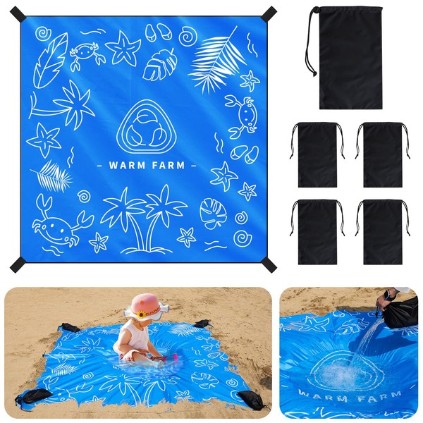 Warmfarm 2-in-1 Beach Blanket & Kiddie Pool,6.56 x 6.56 FT Square Lightweight, Waterproof Polyester Fabric with Weighted Storage Bag & Oxford Fabric Bags, Portable Beach Toys for Safe Play Area (Blue)