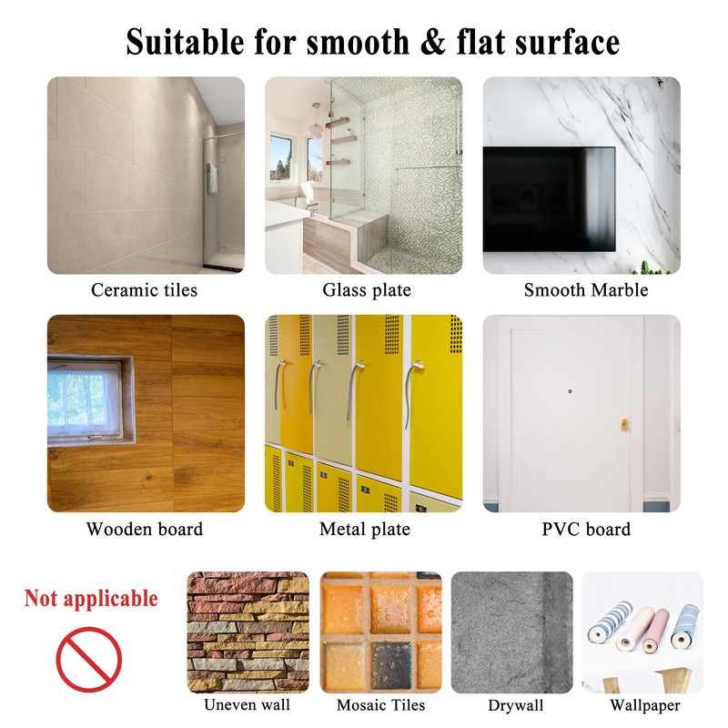 2. It would be better to stick on flat and smooth surface. It may not work at its full capacity on surface such as porous as the tape would not completely stick on the surface.