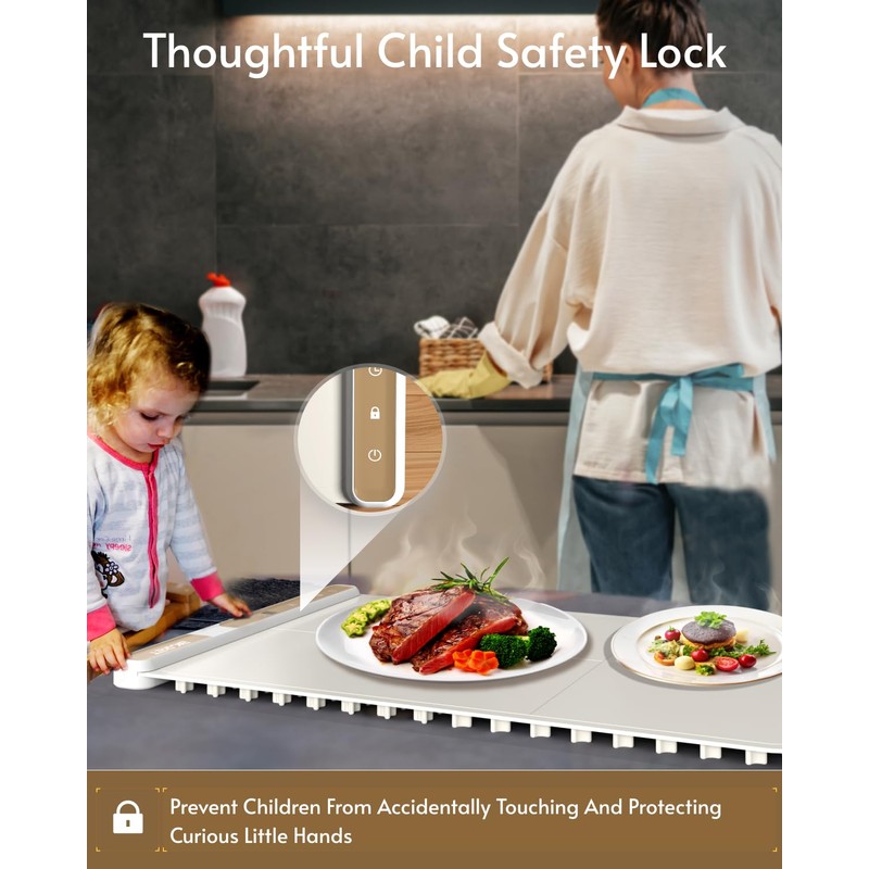 - Child Level Safe Warming Tray - Features a safety lock and auto shut-off after 7 hours to prevent accidental touches. The raised footers are designed to protect the table surface from overheating.
