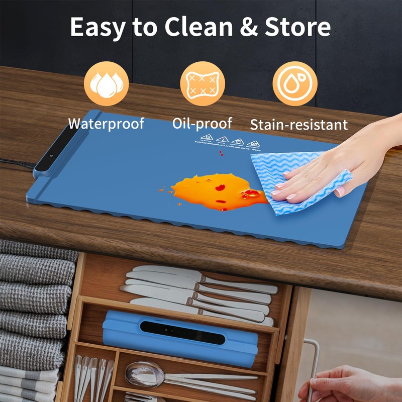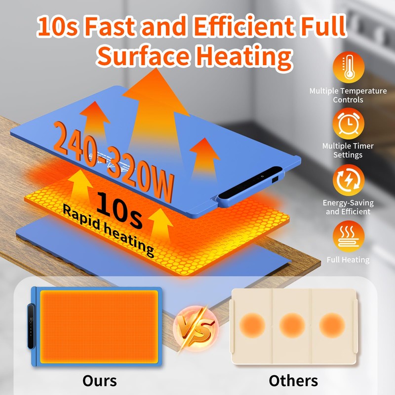 - Fast full surface heating:Warming pads for food,Experience fast and uniform heating in a large heating area within 10s. Allows you to place tableware freely, keep food warm, defrost steak, dissolve chocolate, ferment dough, and warm mask.