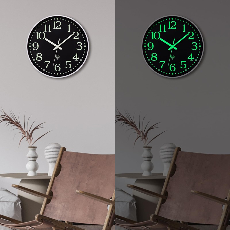 • 【Atomic Glow In the Dark Wall Clock】 The atomic clock numbers and hands which have night light function.Night lights function and long light up time, super quiet and non-ticking, 4 big numbers good for the elderly or the visually restricted people(The wall clock will glow in the dark for 3-6 hours or so, The glow time depends on the light absorbed in the day, The brightness of noctilucent gradually decreases, and it can't stay at its brightest all the time.)